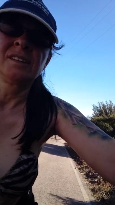 Perverted Tattooed Spanish milf in bike and tiger bikini shows tits on street